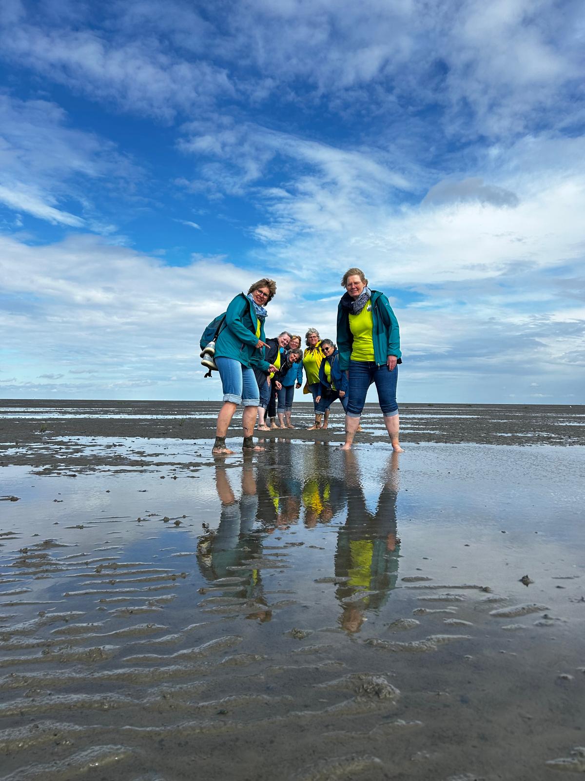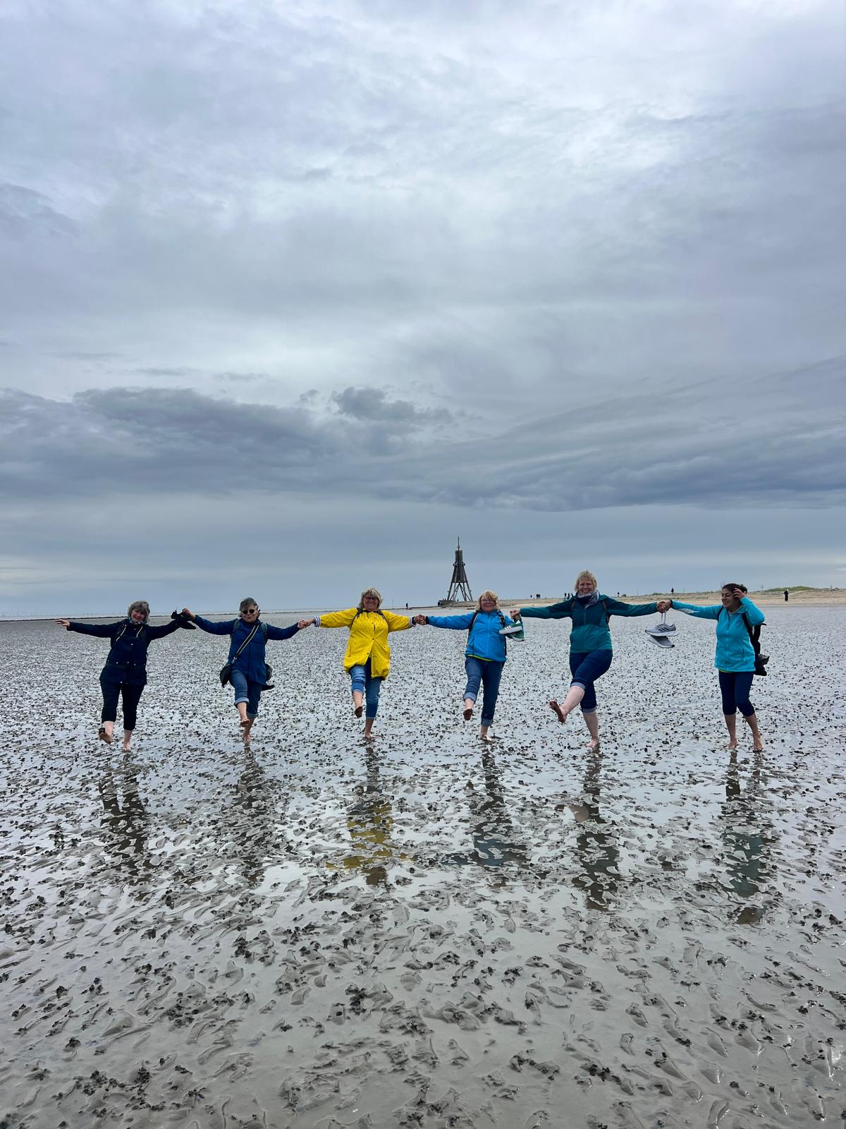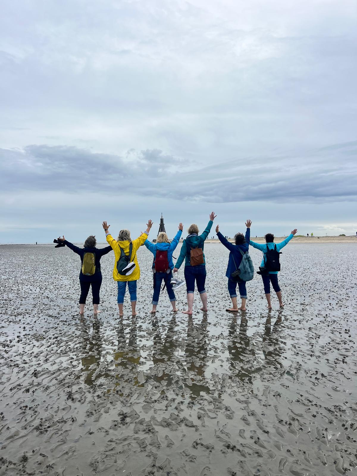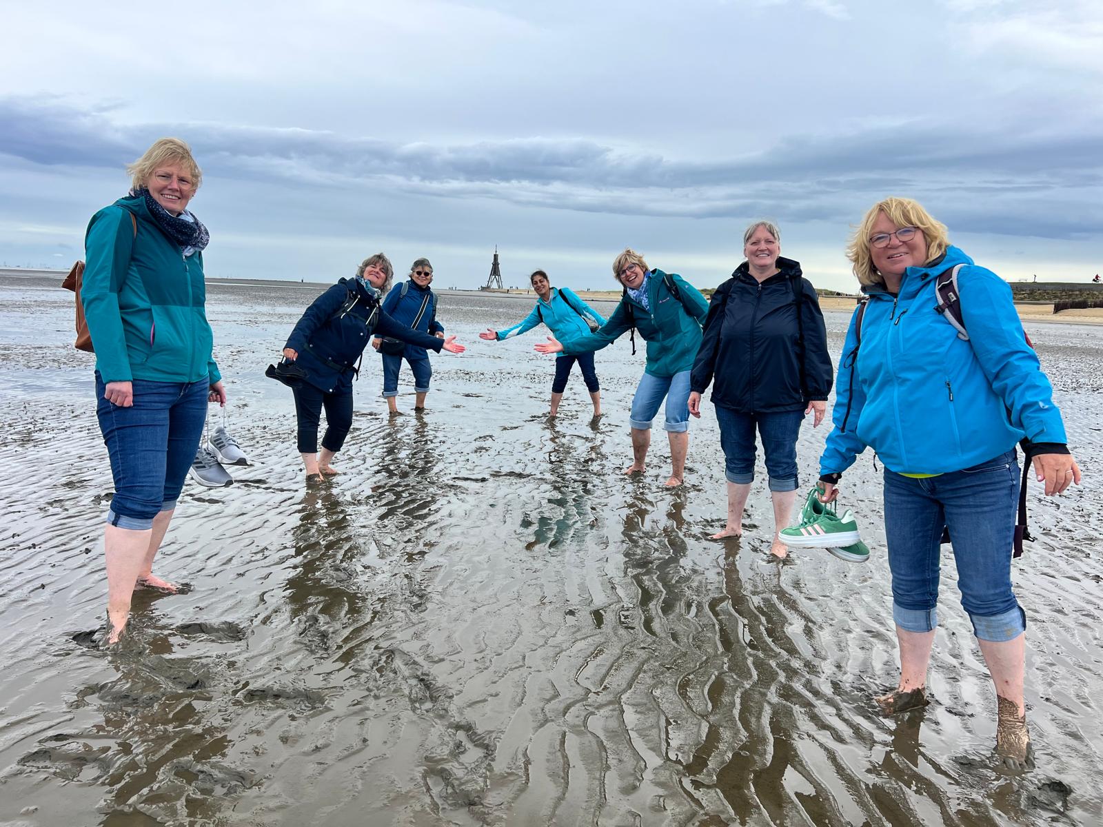 Anschließend teilte sich die Gruppe auf. Da Ebbe war, gingen 6 Frauen zu Fuß, mit hochgekrempelten Hosenbeinen und nackten Füßen, durch das Wattenmeer. Alle hatten sichtlich viel Spaß dabei.
