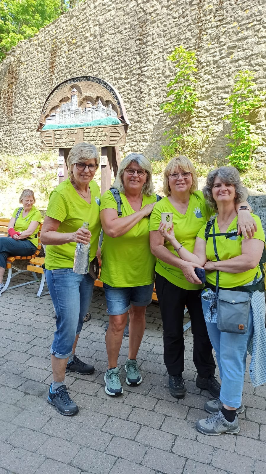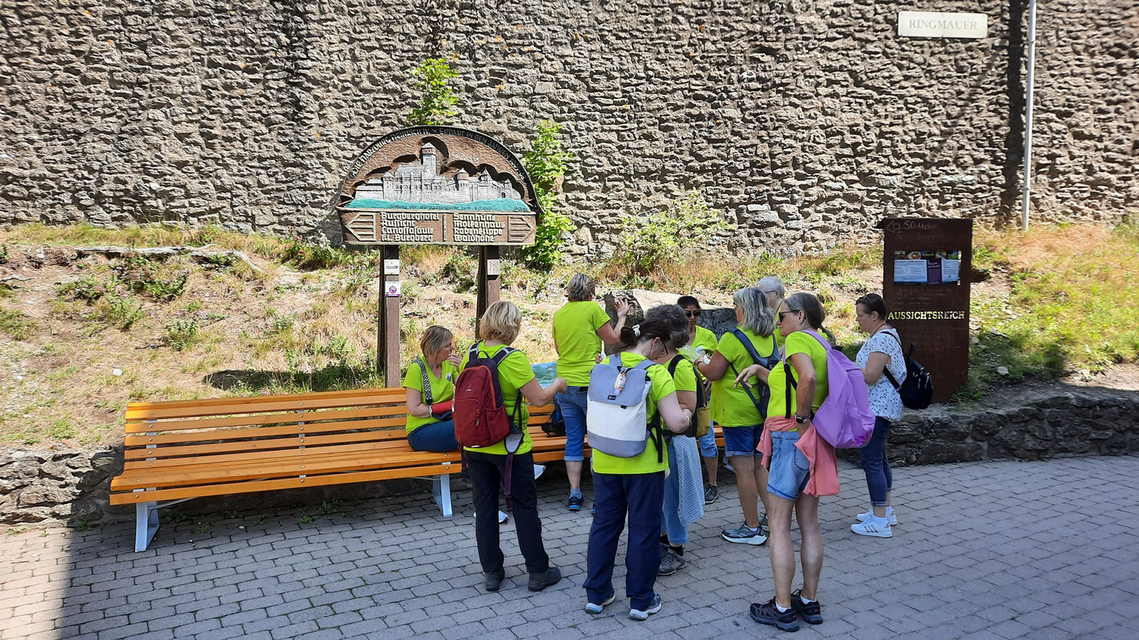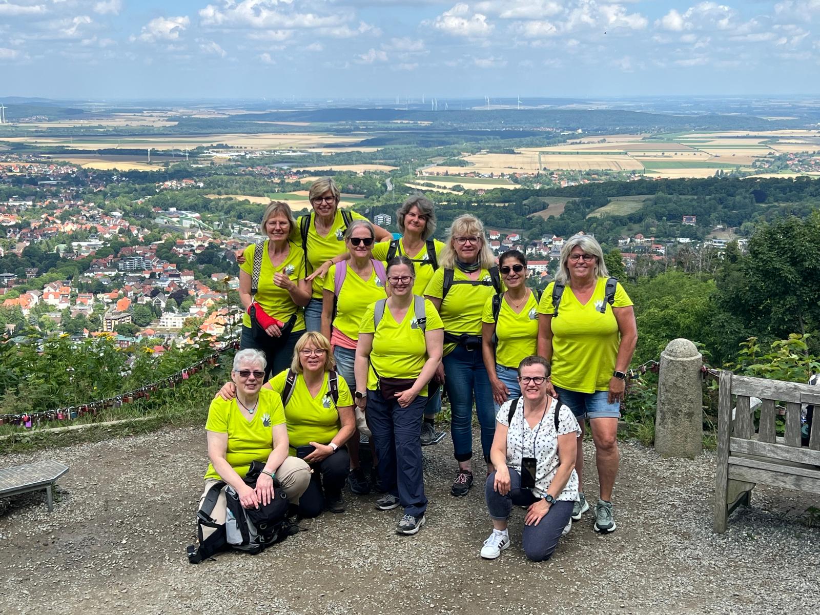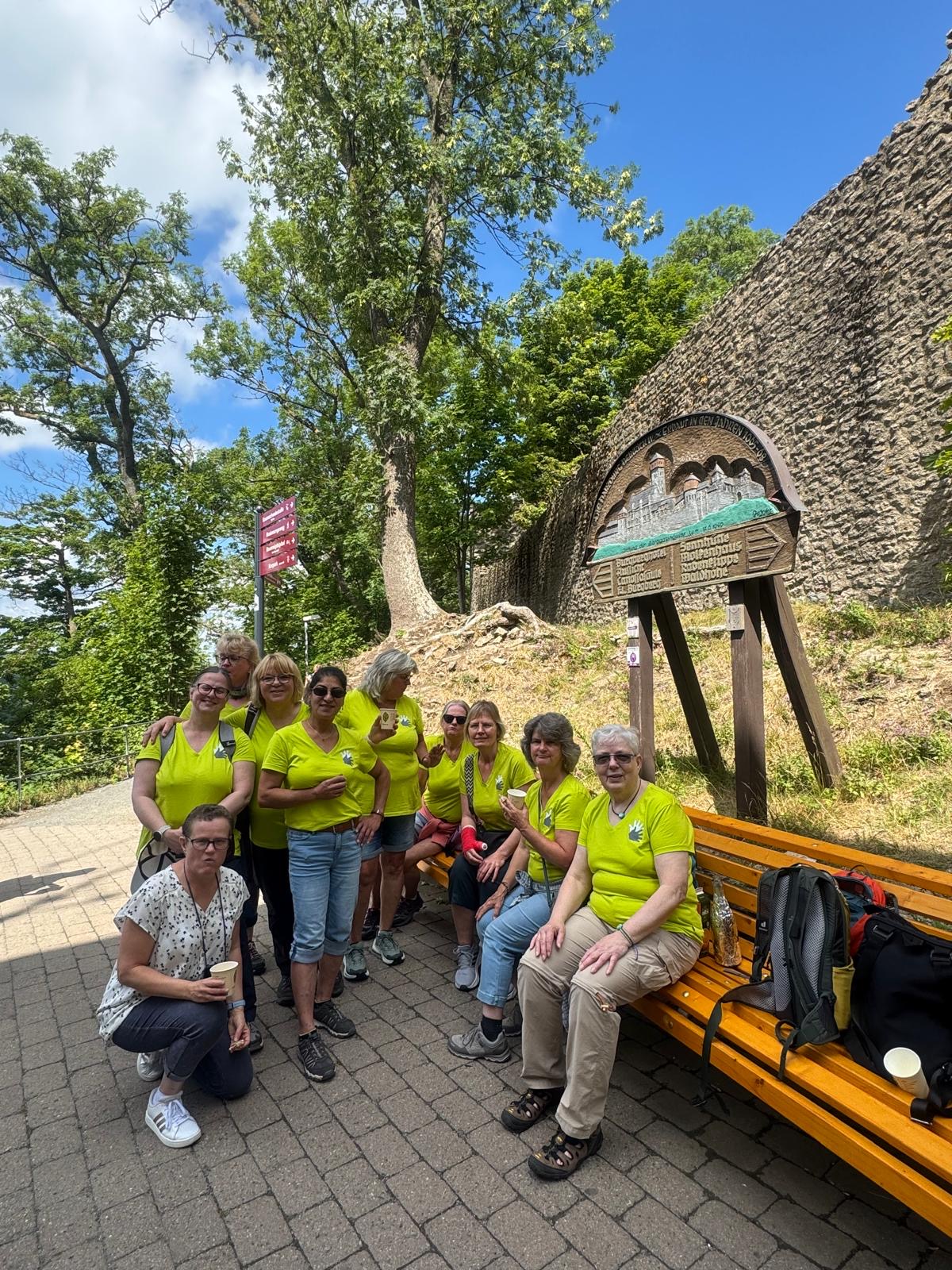 Oben angekommen erwartete uns nicht nur eine großartige Aussicht, sondern auch ein historischer Rundweg mit interessanten Informationen zu dem ehemaligen Harzburg sowie zahlreiche Wanderwege. Besonders auffällig war die „längste Bank zum Sitzen“ – dort machten wir eine erste kleine Pause. Nach der langen Anreise hatten wir alle Hunger. Zur Begrüßung gab es dann noch einen kleinen Umtrunk von unserer 1. Frauenleiterin Annette,