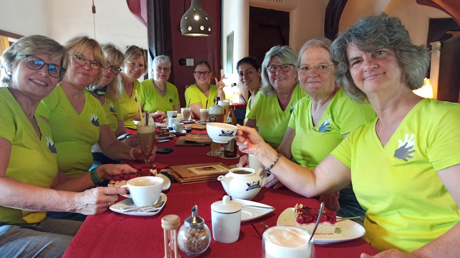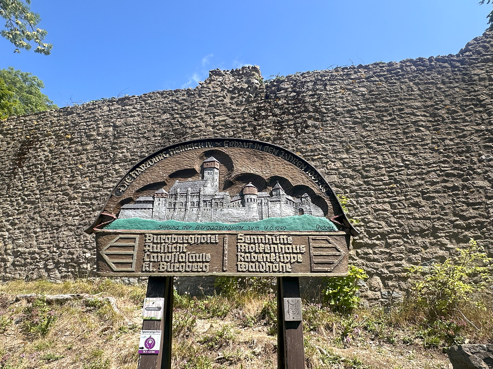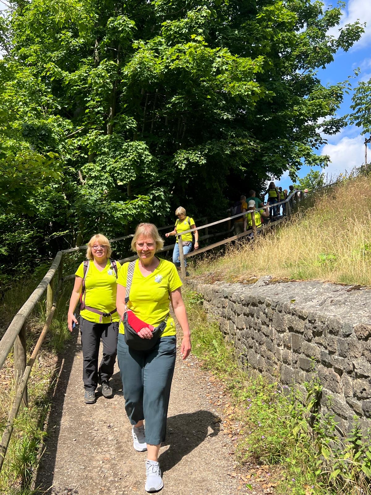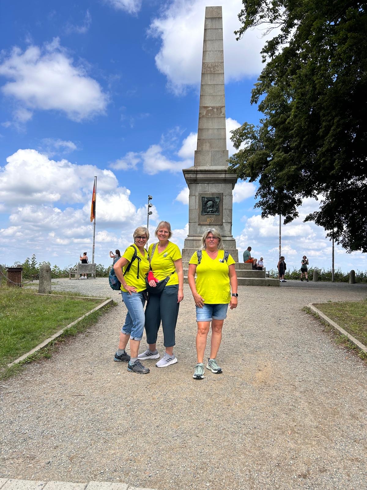 Oben angekommen erwartete uns nicht nur eine großartige Aussicht, sondern auch ein historischer Rundweg mit interessanten Informationen zu dem ehemaligen Harzburg sowie zahlreiche Wanderwege. Besonders auffällig war die „längste Bank zum Sitzen“ – dort machten wir eine erste kleine Pause. Nach der langen Anreise hatten wir alle Hunger. Zur Begrüßung gab es dann noch einen kleinen Umtrunk von unserer 1. Frauenleiterin Annette,