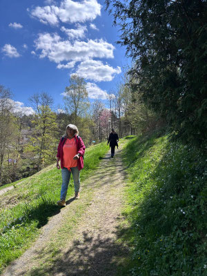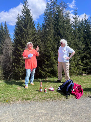 Im Kurpark angekommen, begrüßten uns herzlich unsere beiden Wanderleiterinnen Marina Dettmer und Martina Koch. Zur Begrüßung gab es für alle ein Gläschen Sekt – ein schöner Auftakt bei bestem Frühlingswetter! Einige kauften sich ein Begleitheft für die 7 Stempelstellen entlang des Weges.