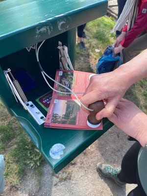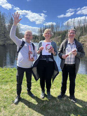 Am idyllischen Hüttenteich legten wir eine Pause ein und verteilten ein kleines Quiz mit sieben Fragen rund um den Herzweg. Die besten drei Teilnehmenden wurden mit kleinen Preisen ausgezeichnet: