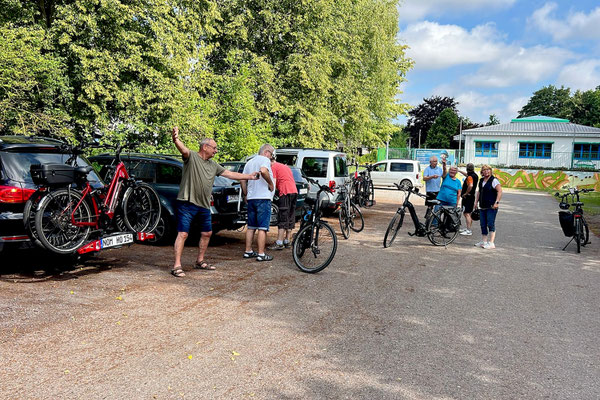Die Tour begann am alten Bahnhof von Petershagen, wo sich die Gruppe auf dem Parkplatz traf.